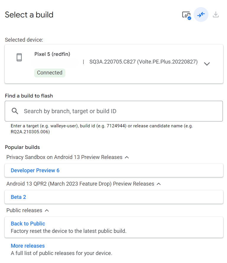对于我这台Pixel5,有几个官方的固件可以选择,由于Pixel5已经停止了软件更新,所以我这里直接选择Back to Public,刷入最新的公开官方固件