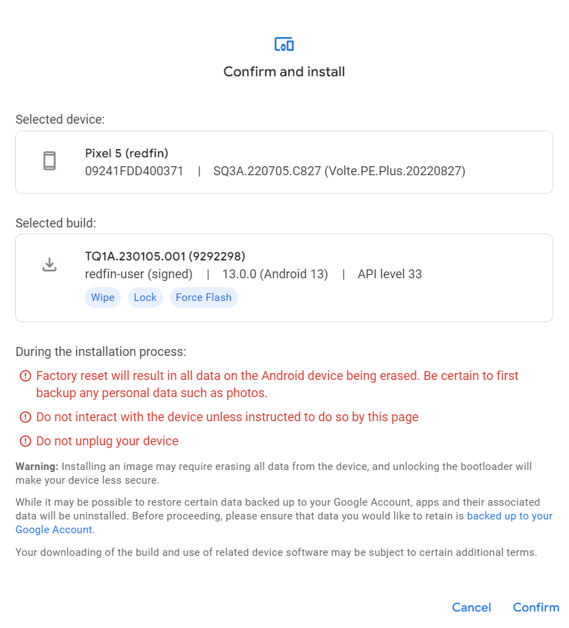 确认无误后点击Install build,进入确认页面,确认我们要刷机的设备无误,以及要刷入的固件和选项设置正确