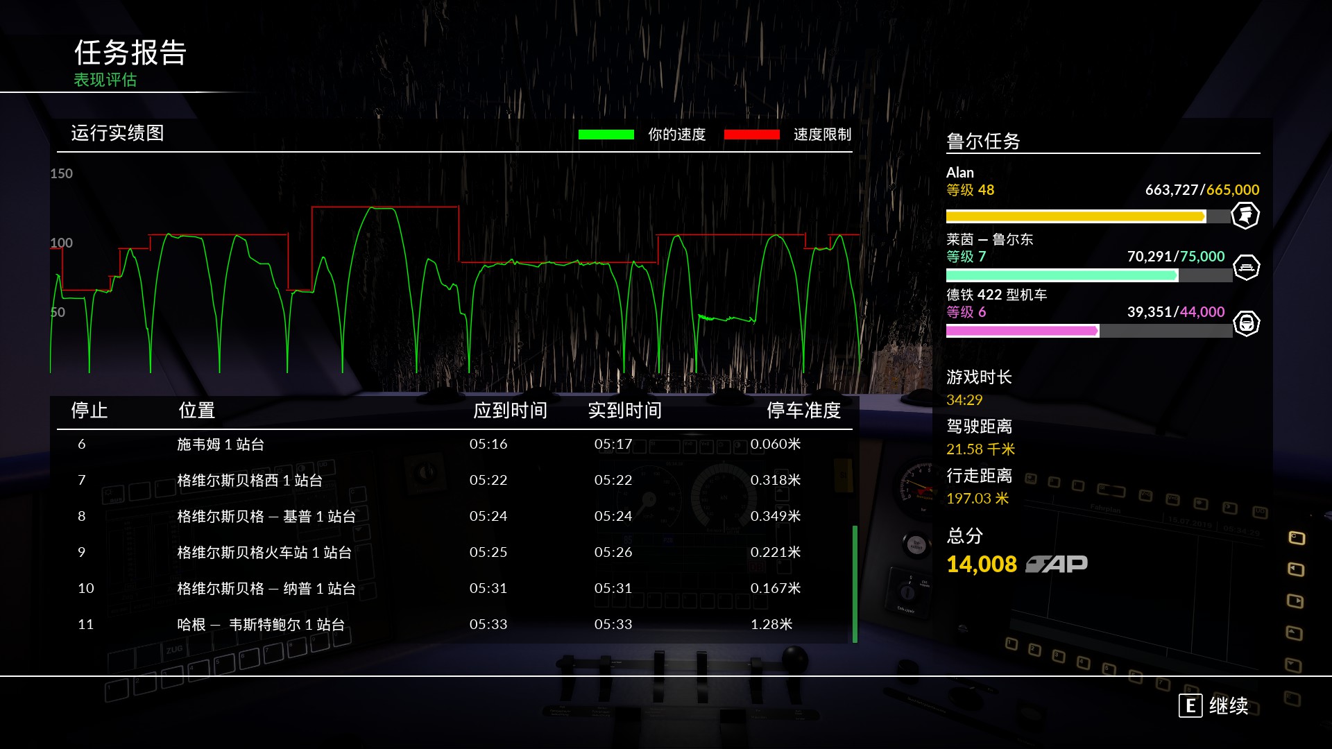 场景任务中的两趟客车任务时间都非常紧张,上车准备动作务必要快,上车、PZB、SIFA、灯光、换向、关门一气呵成,Alan跑了三四趟仍然难以准点,会延误1—2分钟(可能还是窝太菜了),不过金牌并不难拿,但是一定不能被紧急制动,请专心驾驶(